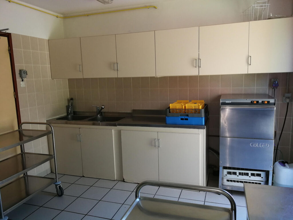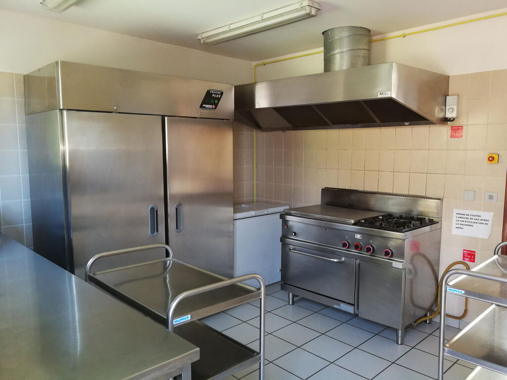 Une cuisine équipée en matériel professionnel : chambre froide, cuisinière, lave-vaisselle, congélateur, micro-onde, cafetières électriques.